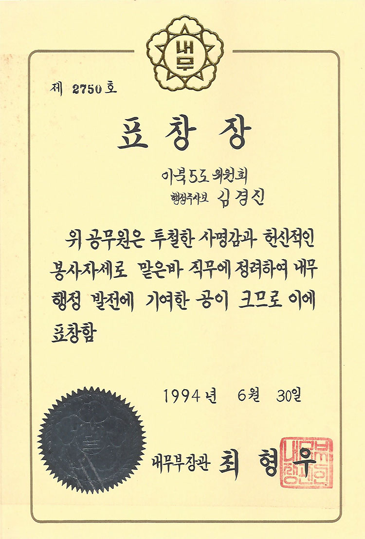 내무부장관표창장