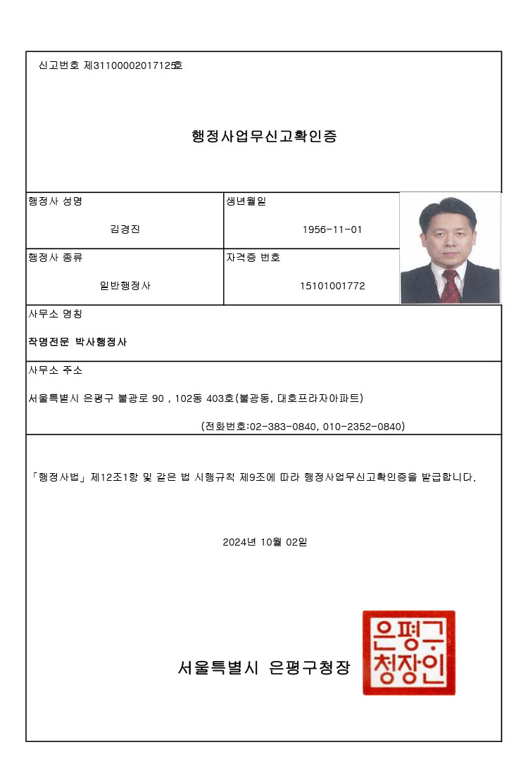 행정사업무신고확인증
